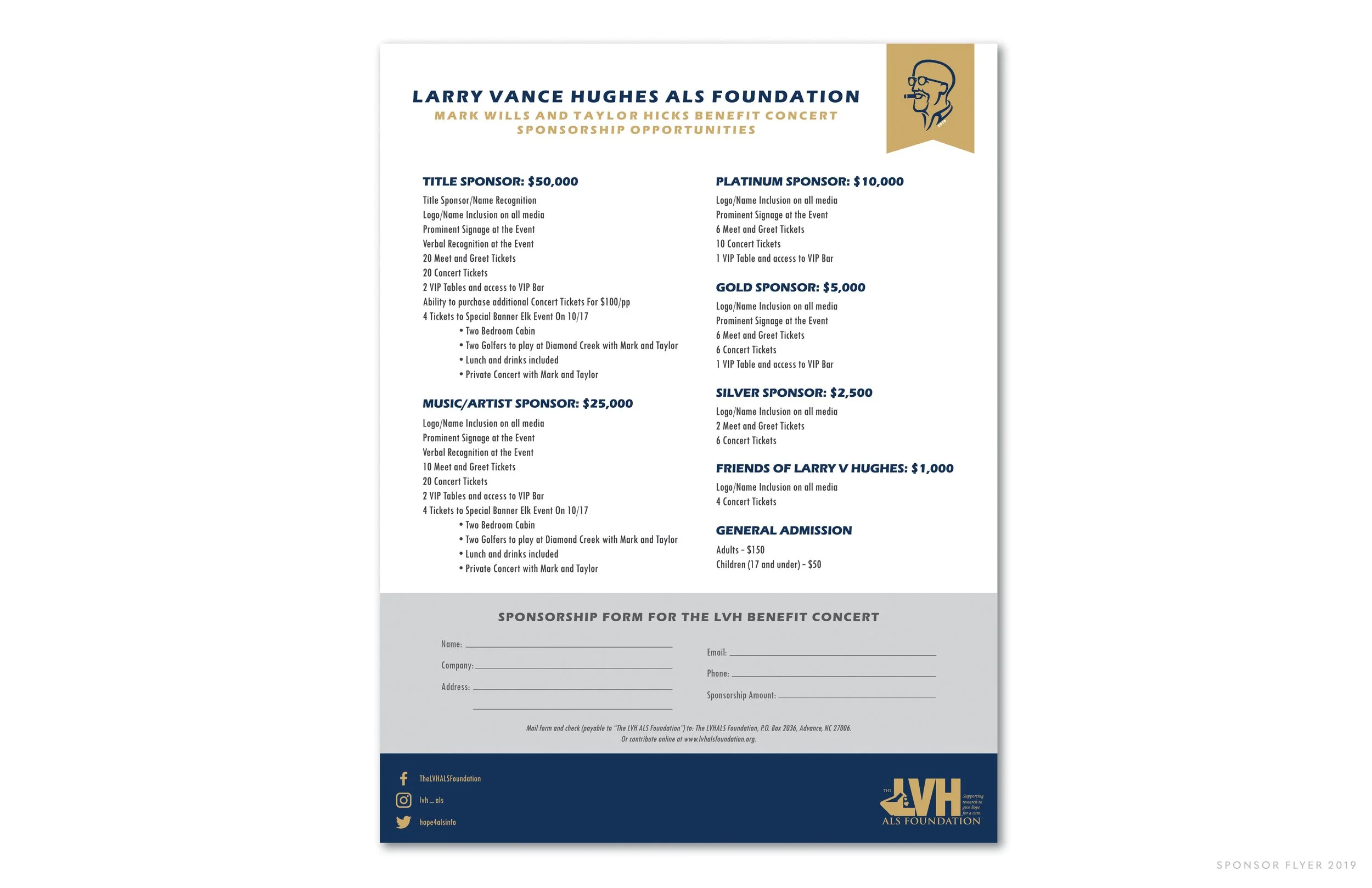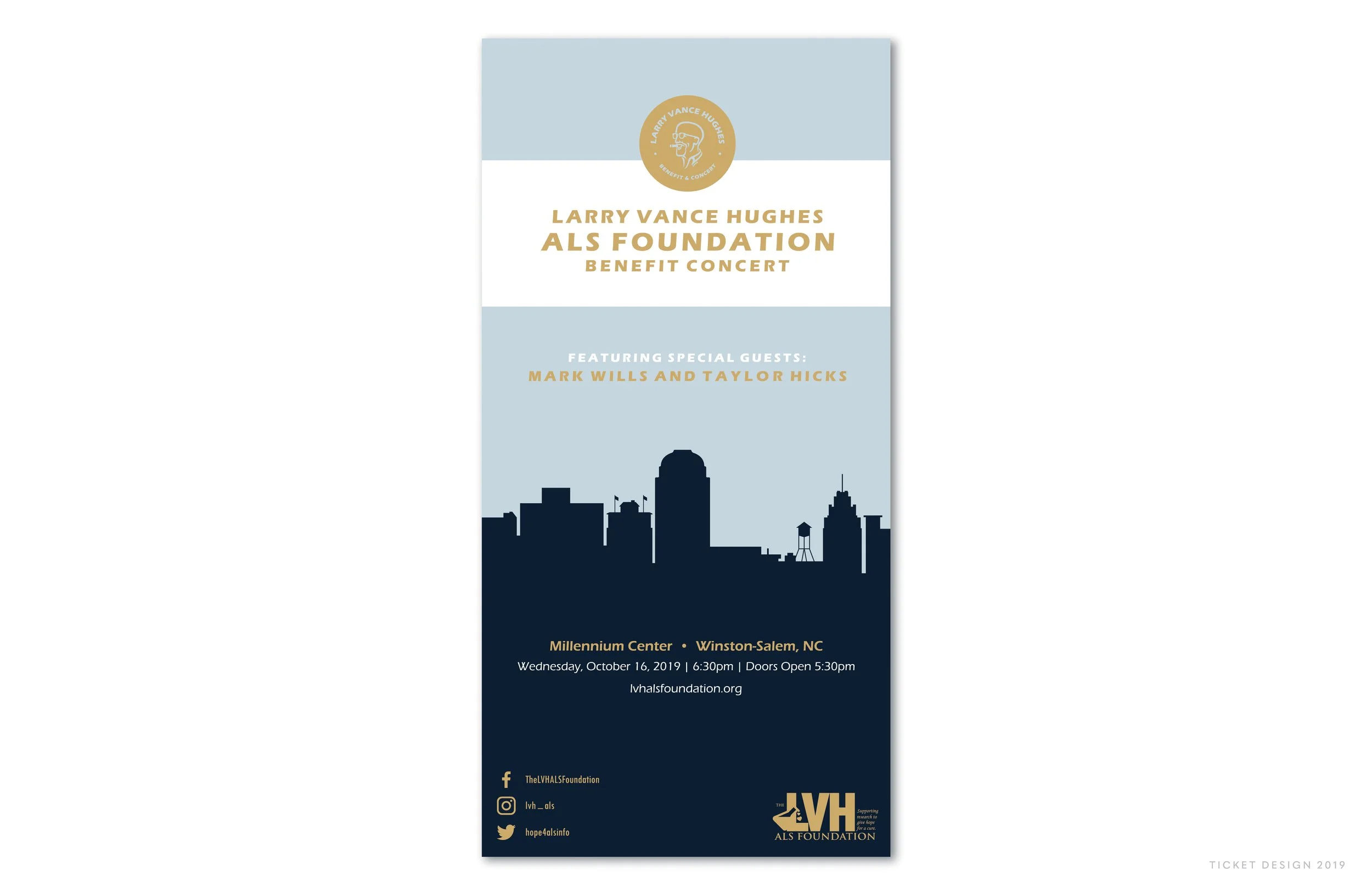 The mission of the LVH Foundation is to provide funding to endow a professorship of ALS at Duke University – not only to help those today with ALS, but more importantly to find a cure for ALS in the future. Established in 2014 by the family of the late Larry Vance Hughes, the Hoge family needed design work done for their annual benefit in 2019. I agreed to do the design work as a charitable contribution and helped redesign the logo and create all of the supplementary materials for the event.